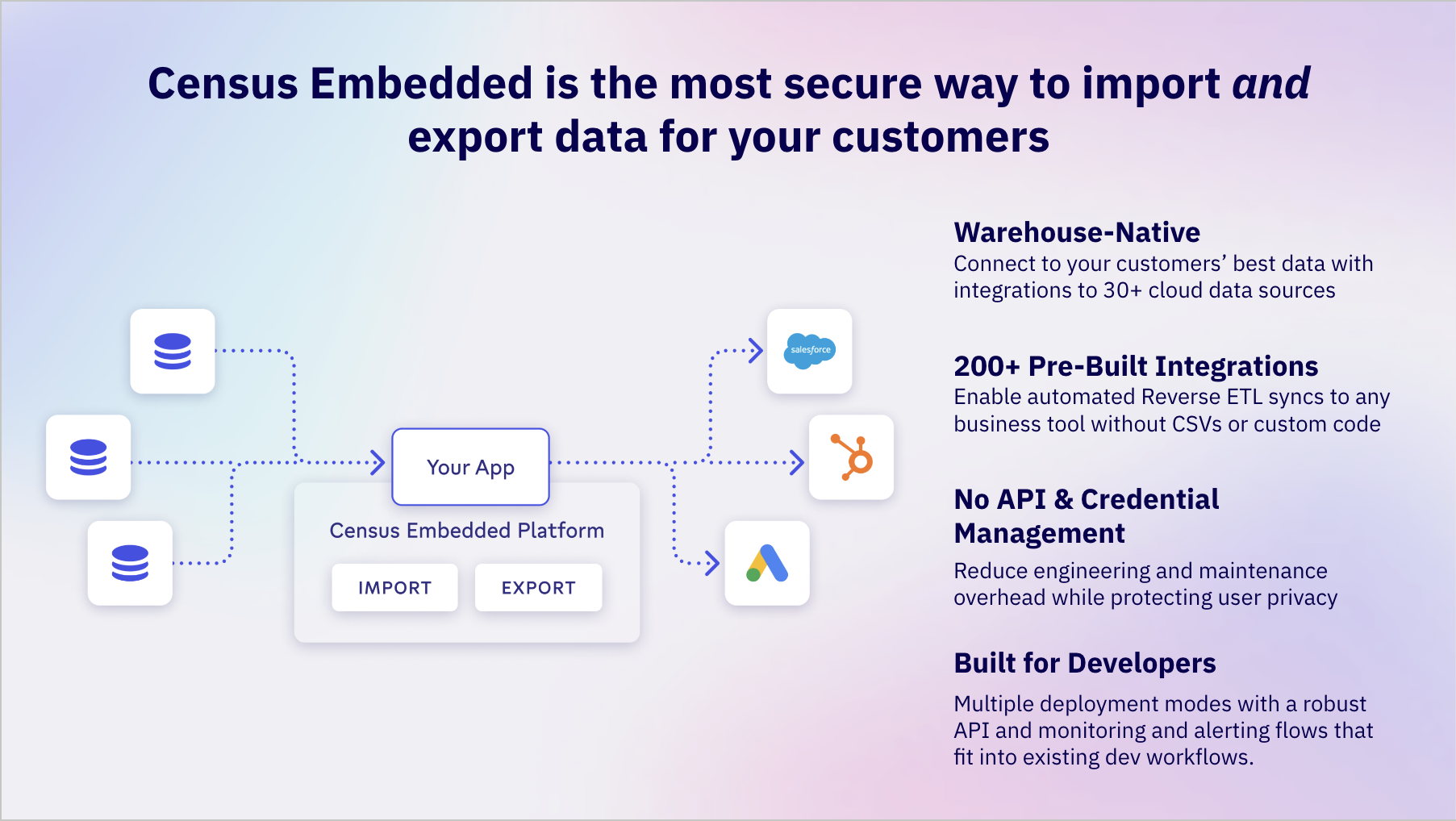 Census Embedded is relevant for a wide range of usecases:- Unleash Your Data’s Potential: Seamlessly push your data into the tools your customers use daily. No more CSVs or hacky import scripts. Increase your data’s value to your customers by syncing it into over 200 business applications, including CRMs and marketing platforms with one simple integration.